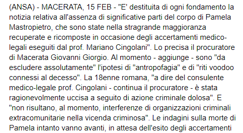 Ora, con incomprensibile insistenza, si nega che possa esserci la feroce mafia nigeriana dietro questa squallida storia, si dichiara con inusuale frequenza che possano esserci dei risvolti magico-rituali e si precisa che nessuna parte del corpo è stata prelevata. Salvo poi, nella stessa circostanza, ammettere che non tutte le parti del corpo della diciottenne Pamela –innocente vittima di un bestiale delitto- sono state ritrovate ma solo la “stragrande maggioranza” (CLICCA QUI).